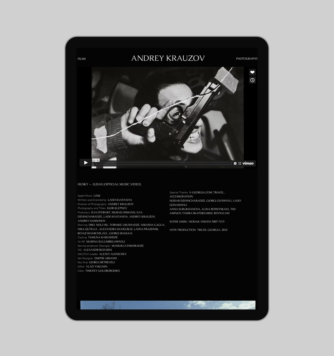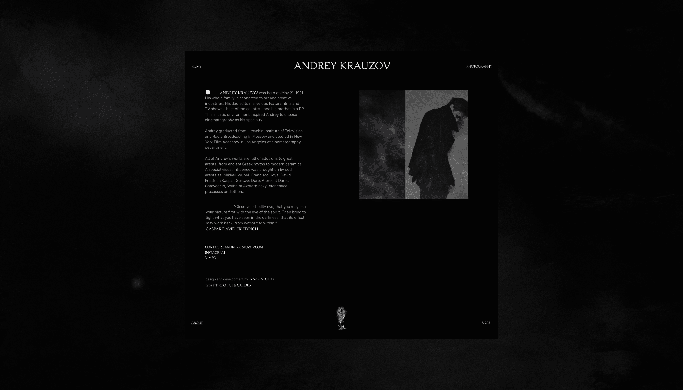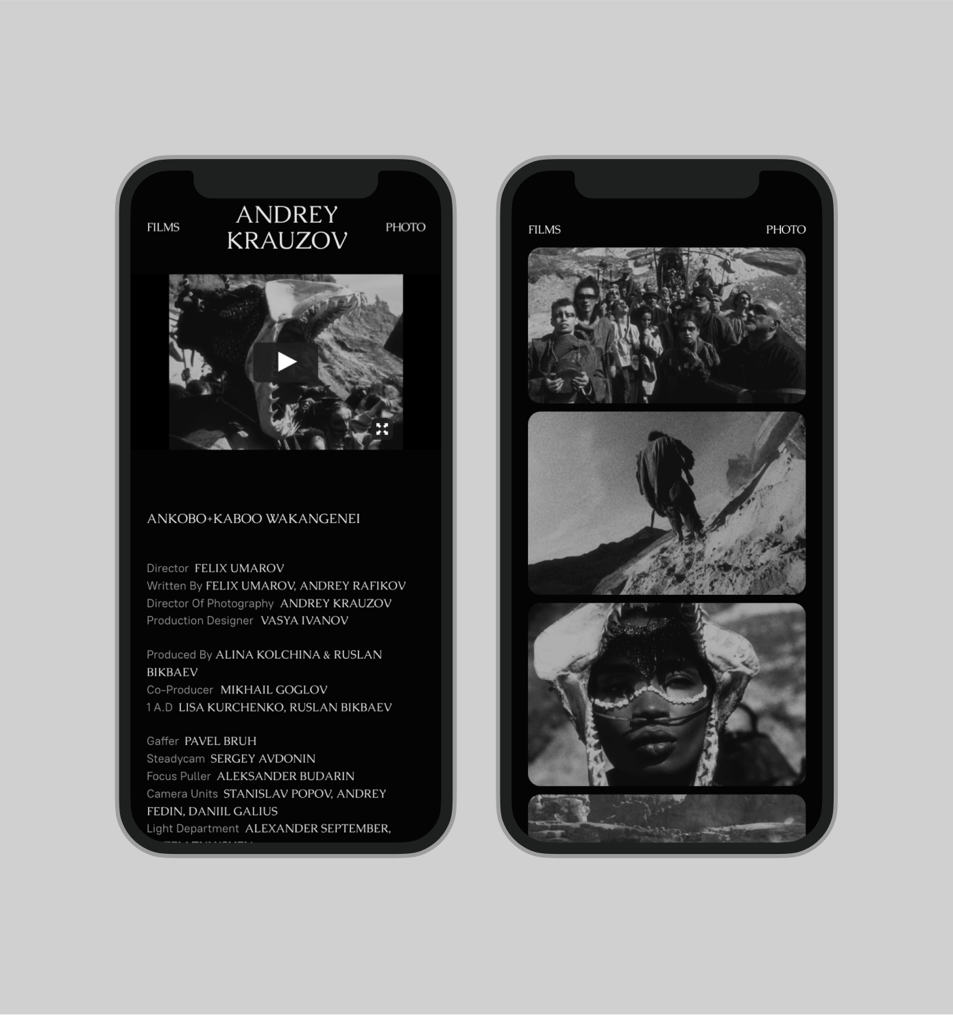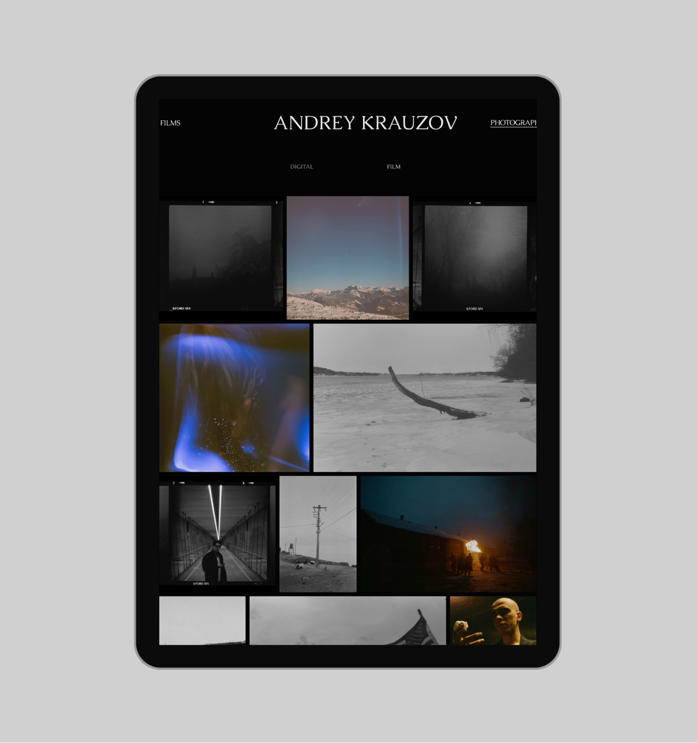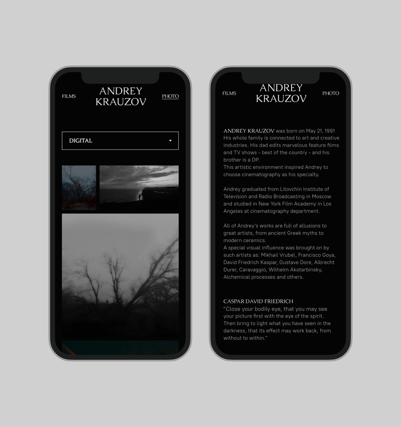 Based on the individual style of Andrey Krauzov, we have developed a portfolio site containing the most iconic Andrey’s works. The main sections "films" and "photo" are always fixed, so it is easy to find them from any site’s page. Corner-rounded catalog cards refer to old film frames and filmstrips. When you hover on the card — the frame comes to life. The "Caudex" font conveys an antique, slightly gothic mood and appropriately complements the author’s dark graphics made by illustrator Artem Grigoriev (black typography). For the inner pages we’ve used a combination of Serif (Caudex) and Grotesque fonts (PT Root).