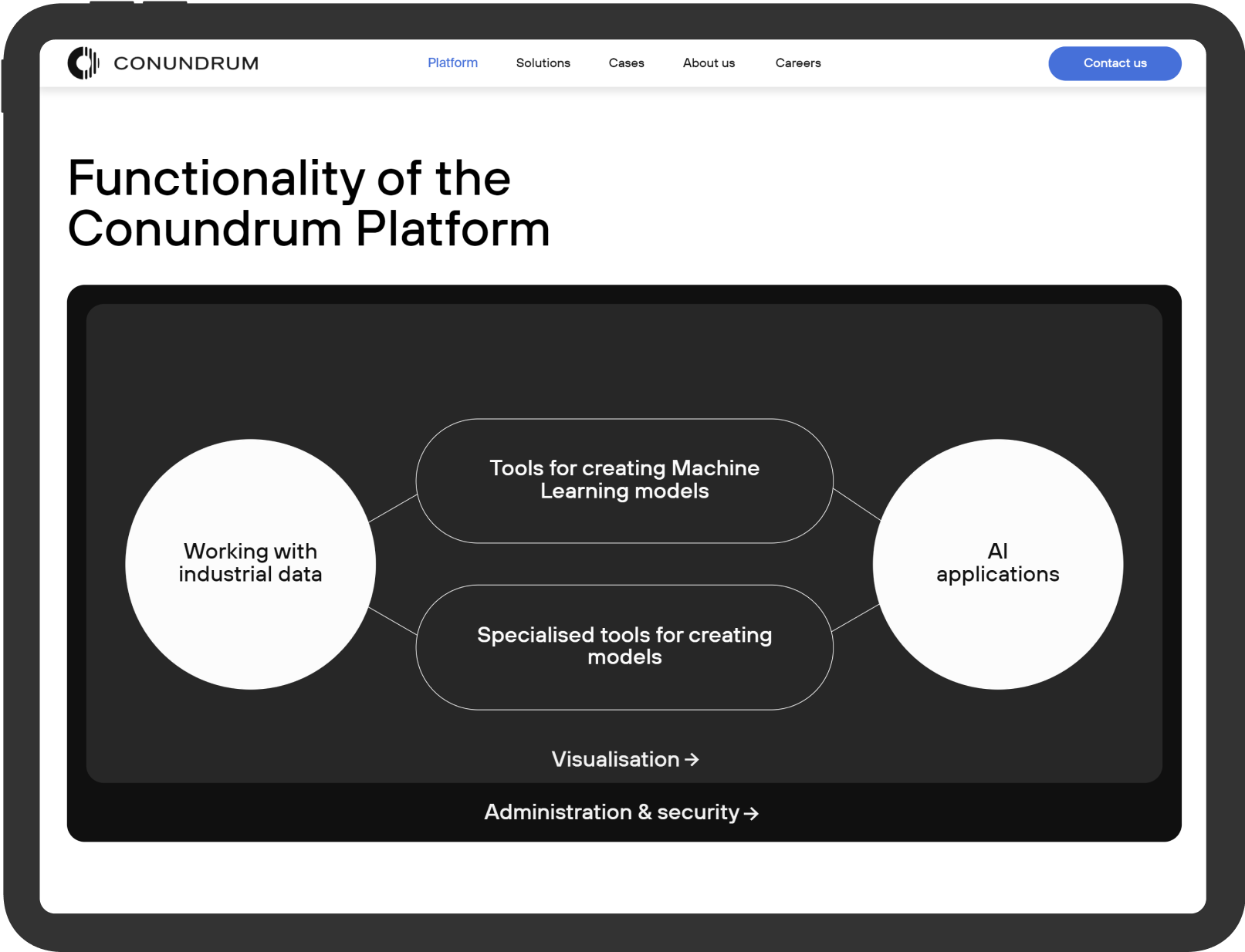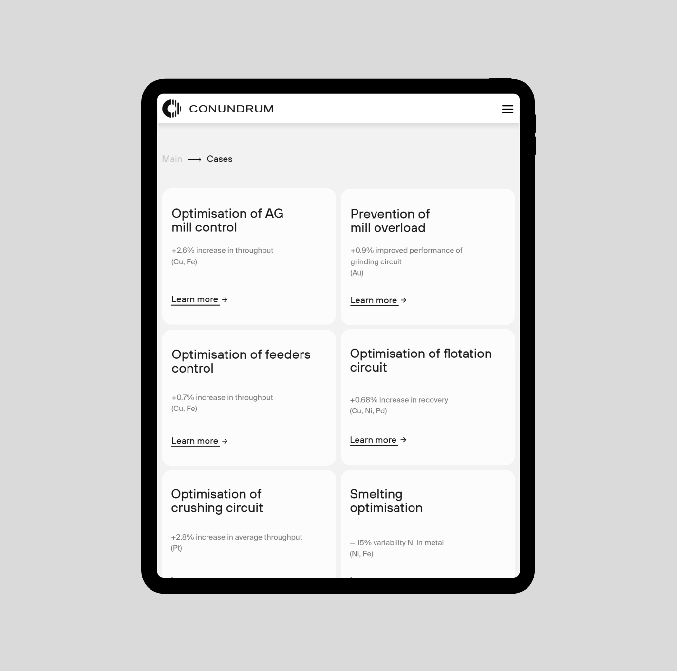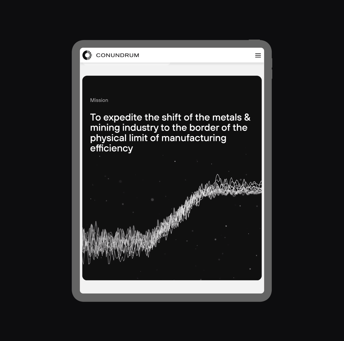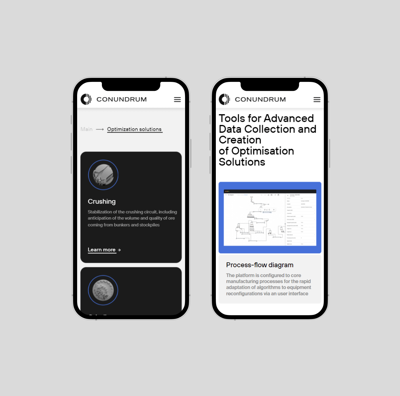 Logosign is based on the principle of the drum mill’s operation. The process of ore enrichment was taken as a logo composition: grinding ore into dust. The sign shows the structure of the data before Conundrum implementation (solid, unfiltered) and after (structured, understandable).