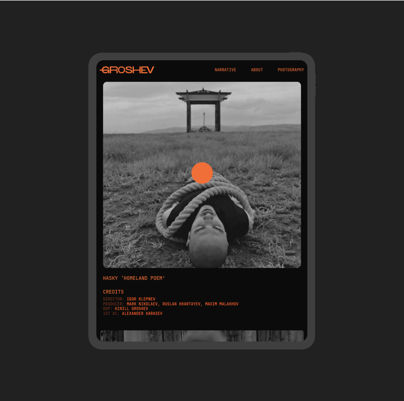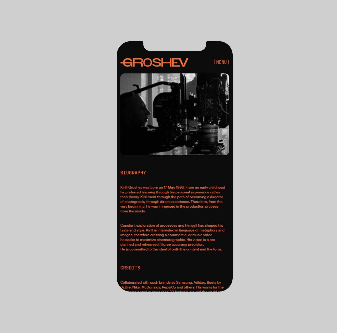 Kirill Groshev is a director of photography (DOP), has worked with brands such as Adidas, Beats by Dr. Dre, Nike, McDonalds and Pepsico. His work has been featured in over 20 festivals around the world and has received awards such as Best Music Video Cinematography.